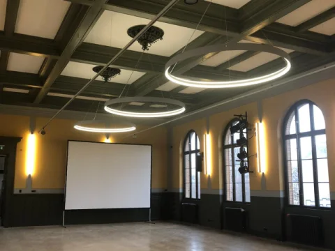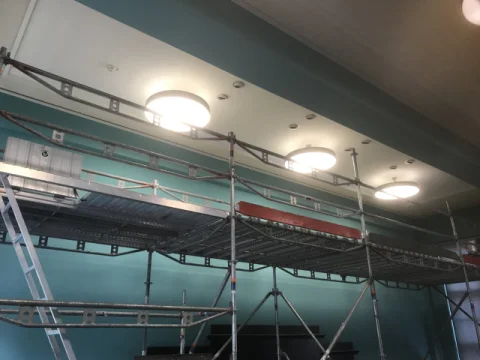 Rekonstruktion und Gestaltung der Aula des Kultur- und Bildungszentrums Sebastian Haffner in der Prenzlauer Allee nach restauratorischer Befunduntersuchung und Freigabe der UD an Holzdecke und Kalkputzwänden.
