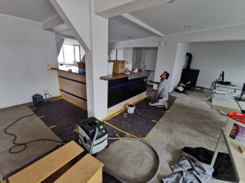 Komplette Neugestaltung aller Büroräume sowie des Treppenhauses. Ausführung aller Maler- und Lackierarbeiten samt Bodenbelagsarbeiten.