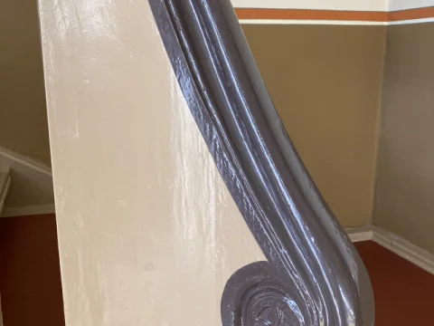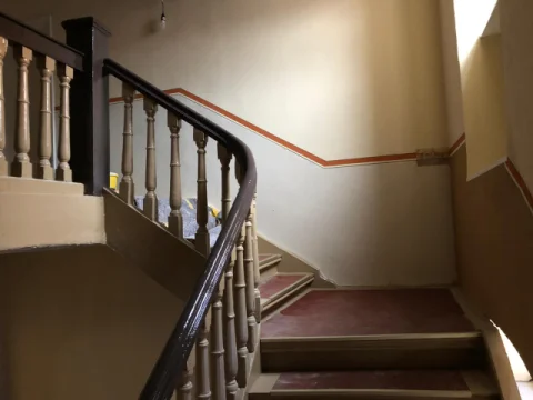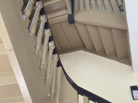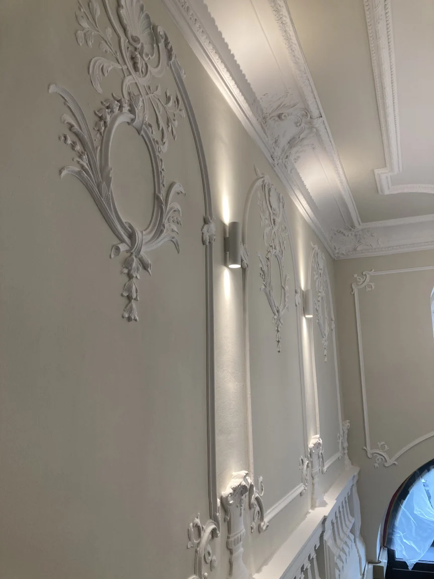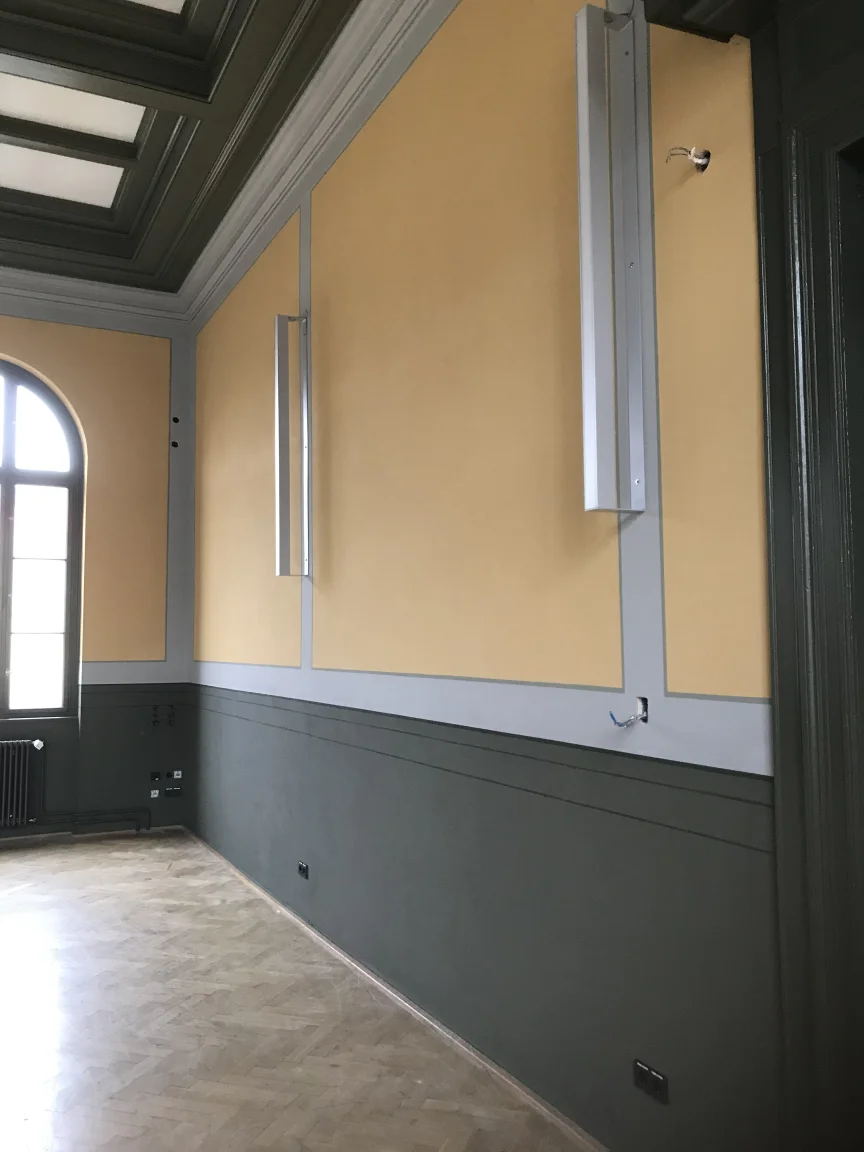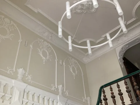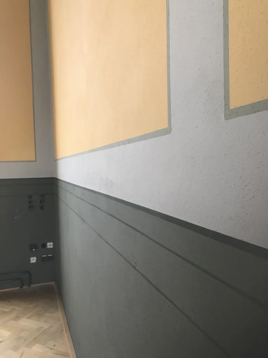 Farbige Umgestaltung der Treppenhäuser sowie des historischen Eingangsfoyers nach Farrow & Ball- Farbkonzept. Applikation von Schmuckleisten mit Stuck.