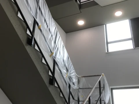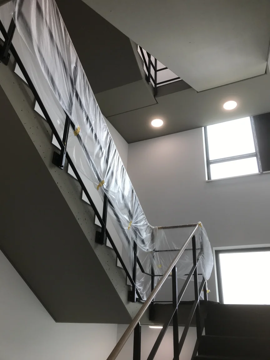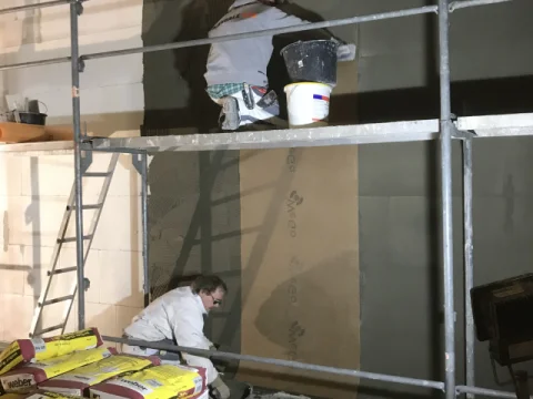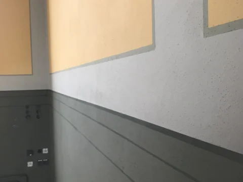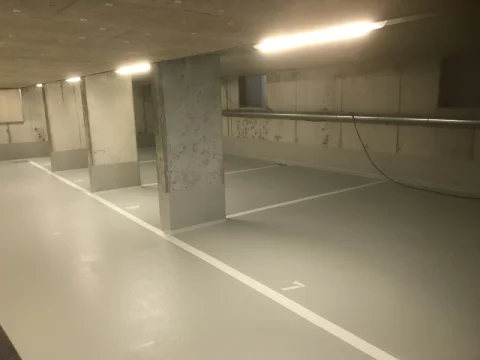 Betonflächen in einem Mehrfamilienhaus mit Ardex B12 glätten und mit KEIM Concretal-Lasur in Betonoptik lasieren. Circa 3.000 m² Malervlies kleben und dispersionsbeschichten. Ausführung einer OS8-Beschichtung in der Tiefgarage.