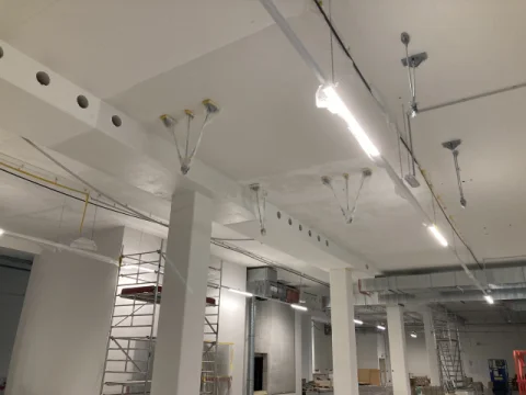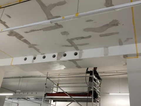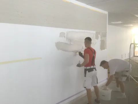 Bürogebäude-Neubau am Groß-Berliner Damm: Circa 2.000 m² vollflächig spachteln und Glasfaservlies kleben, ca. 4.000 m² beschichten.