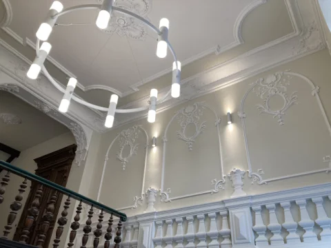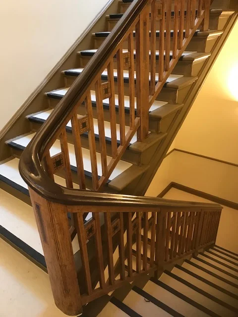 Neugestaltung des Haupttreppenhauses: Maler- und Bodenbelagsarbeiten, Spachteln der Decken und Wandflächen sowie Freilegen der Holzintarsien.
