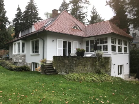 Fassade mit KEIM Soldalit für Einfamilienhaus in Babelsberg. Holzgebälk und Dachüberstand mit Owatrol.